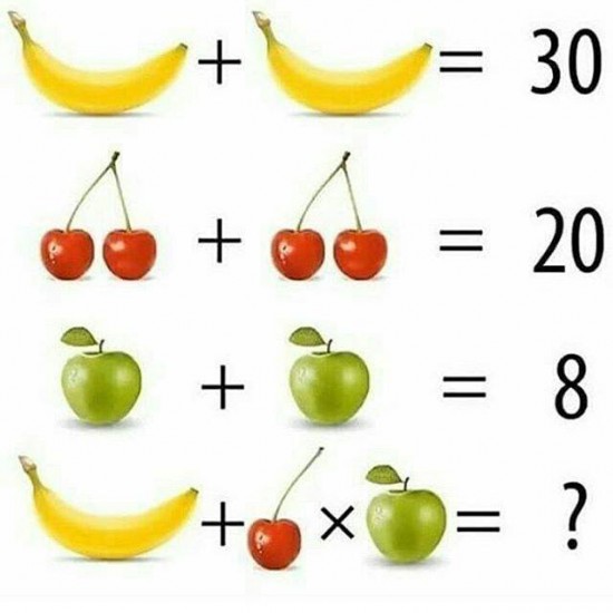 خیلی راحتههر موز ۱۵هست هر گیلاس دوقلو۱۰هست هر سیب ۴هست حالا پایین گیلاسمون دوقلو نیست و یکی هست پس باید گفت که ۱۰÷۲=۵ یک دونه گیلاس ۵هست پس موز۱۵+یک دونه گیلاس۵ ×سیب۴=۸۰ ۱۵+۵=۲۰ و۲۰×۴=۸۰