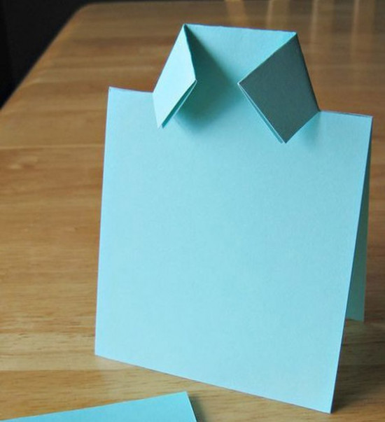برای درست کردن کارت پستال روز پدر مدل پیراهن ابتدا یک کاغذ را به شکل مستطیل در آورید. بعد آن را از وسط تا بزنید. حال دو طرف قسمت تا خورده را مثل تصویر زیر یک برش کوچک بدهید. بعد گوشه ها را به سمت داخل تا بزنید.